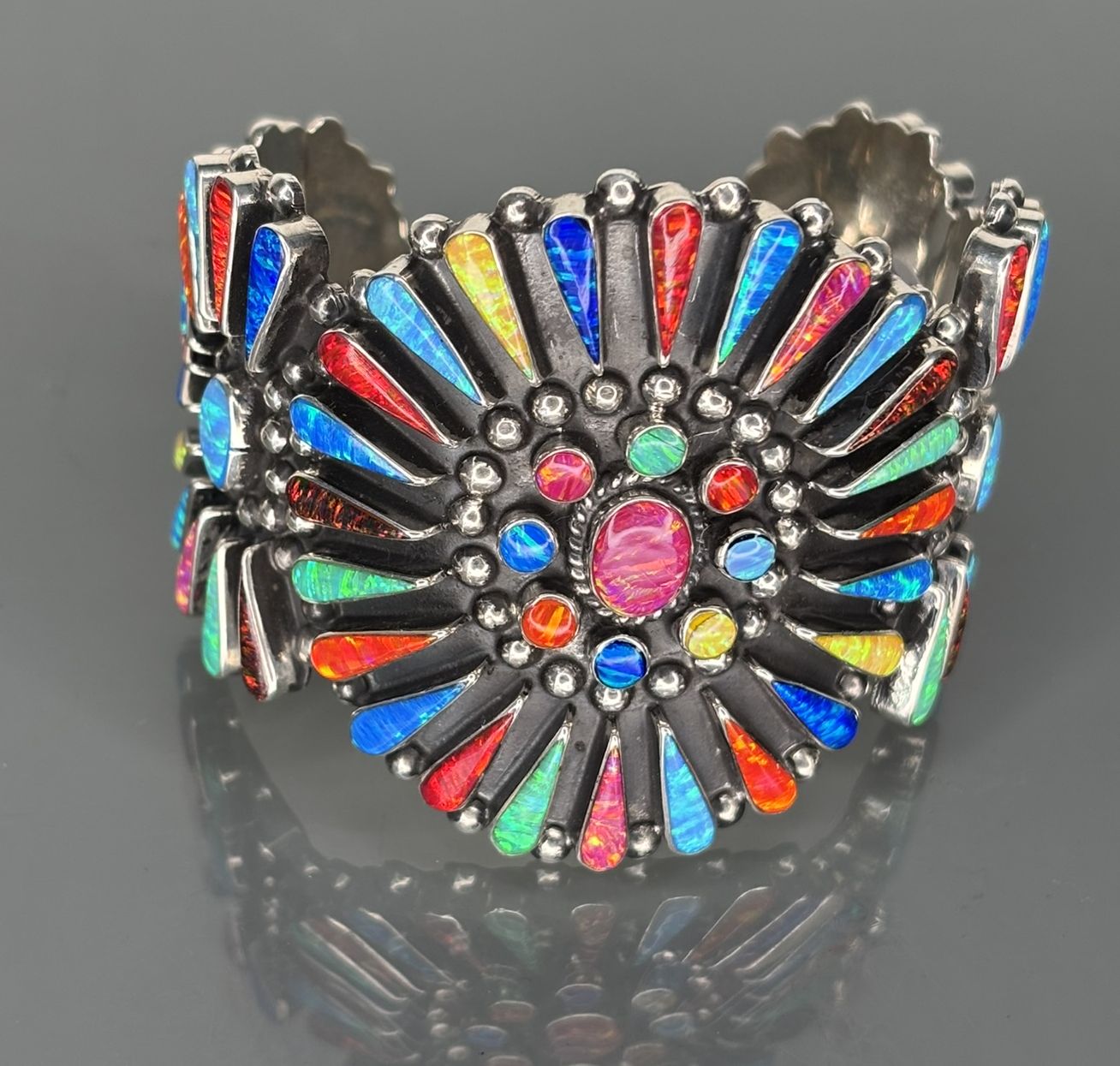 Handcrafted from .925 sterling silver, this Native American Navajo needlepoint bracelet showcases a vibrant array of multi-colored stones. The intricate design and meticulous craftsmanship make it a unique statement piece, perfect for adding a touch of artisanal elegance to any collection.